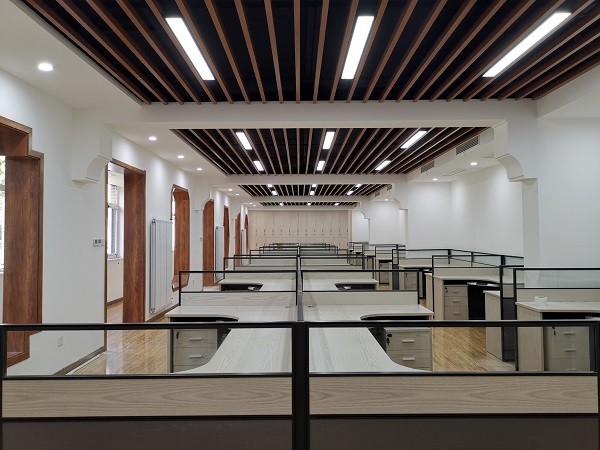 在该项目的装饰设计中,河北四建充分利用原建筑条件,在尽可能节约装修成本的基础上,将办公环境打造成为简约优雅、别具一格的空间。改造区域原为多个小型办公室,并且处于院落的南面,采光极差。设计师经过与领导协商,除保留个别房间外,将剩余的几个办公室隔墙拆除,从而获得了一个大而开敞的办公区,可容纳36个宽敞工位,并取消此办公区域所有的门,且将原窗户台面降低至距地40厘米高,最大可能的利用了自然采光。色调的选择上,墙面大面积采用白色乳胶漆与硅藻泥,一定程度上也弥补了自然采光的不足。